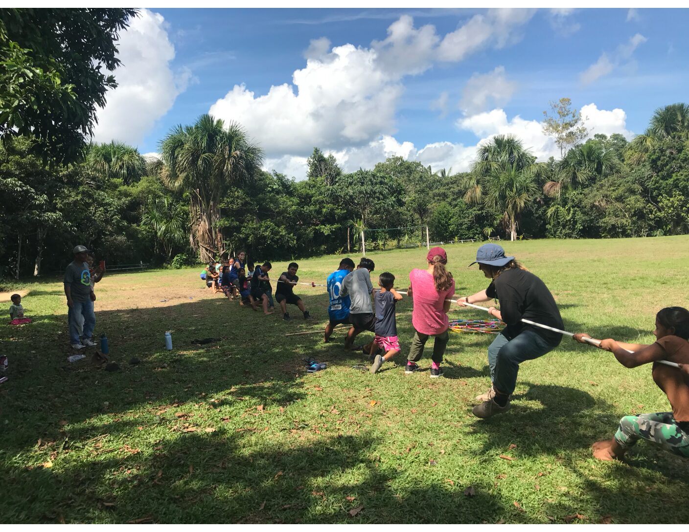 Today was our first full day in the community that we will work with for the next 3 days. Our service projects today involved fixing and painting the stands next to their soccer field, painting school buildings and painting their water tower. We worked alongside community members and (attempted) to have conversations and talk with the adults and kids. As we worked, it became clear that the community members really loved their community and were very proud of it. The mayor of the community worked alongside us and helped everyone with their tasks, which exemplified our theme of today, moral courage. His presence and involvement with our experience helped all of us feel supported by the leaders of the village. After our tasks were completed we ate lunch in the (somewhat) cool shade. It was a welcome break from the hot hot sun. Although there is never a break from the humidity (which is quite the adjustment for those of us from places with no humidity), the afternoon was filled with playing games with the people from the community, kids and adults alike. We played several games with hula hoops, soccer, tug of war and had sack races. Once we finished our games we headed back to the lodge and on the way enjoyed the lovely views of the rainforest and the river. Many people were gathered on the riverbank as we passed by who we waved to. Back at the lodge we were greeted by adorable squirrel monkeys who were feasting on bananas left out by the staff here. Before dinner we all enjoyed down time, some of us told stories in the hammocks while others rested. We had an amazing chicken dish for dinner and then headed to the boat for our night nature tour. The tour was watched by an almost full but still bright moon as well as many stars. Not many animals were visible to us but we did see several sleeping birds and a frog. The bugs, however, made themselves very well known to us; we saw several BIG spiders, a leaf katydid, several moths who were bigger than the hummingbirds we saw, sleeping butterflies, and of course, more spiders. We’re not spider fans here. We’re not large spider fans here. We’re also not swimming spider fans here. There’s nothing quite like looking to the side and seeing a spider doing a breaststroke towards you— I think we all would like to forget that bit. While trying to forget the the spiders we saw we headed to the showers to find ANOTHER very large spider, after seeing the spiders on the boat trip it was a spider overload. Aside from general heebie jeebies we all settled in for another night in the Amazon.